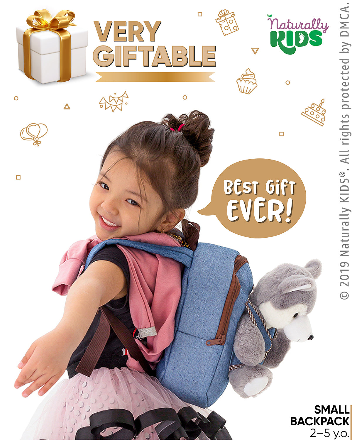 ✈️ Travel, play & learn: Naturally KIDS denim preschool backpack — kindergarten rolling backpack for kids — toddler airplane travel bag — toddler travel toys for kids ages 3–5 and 4–8.