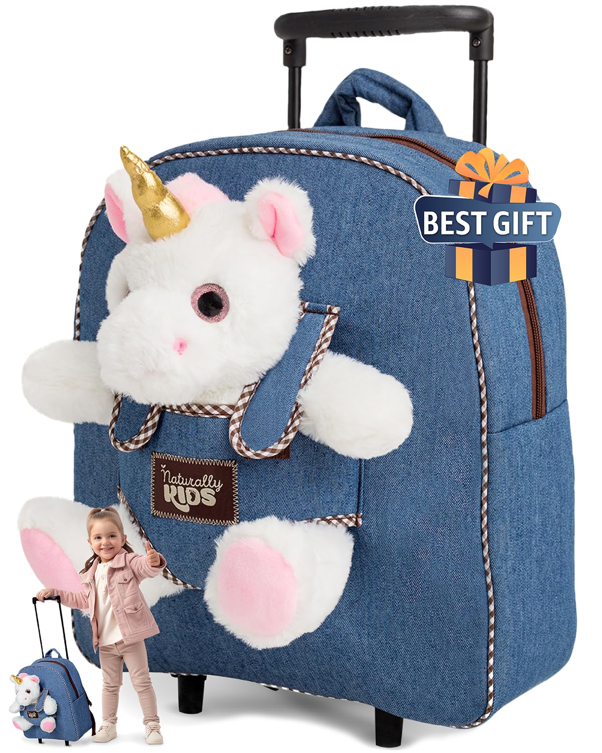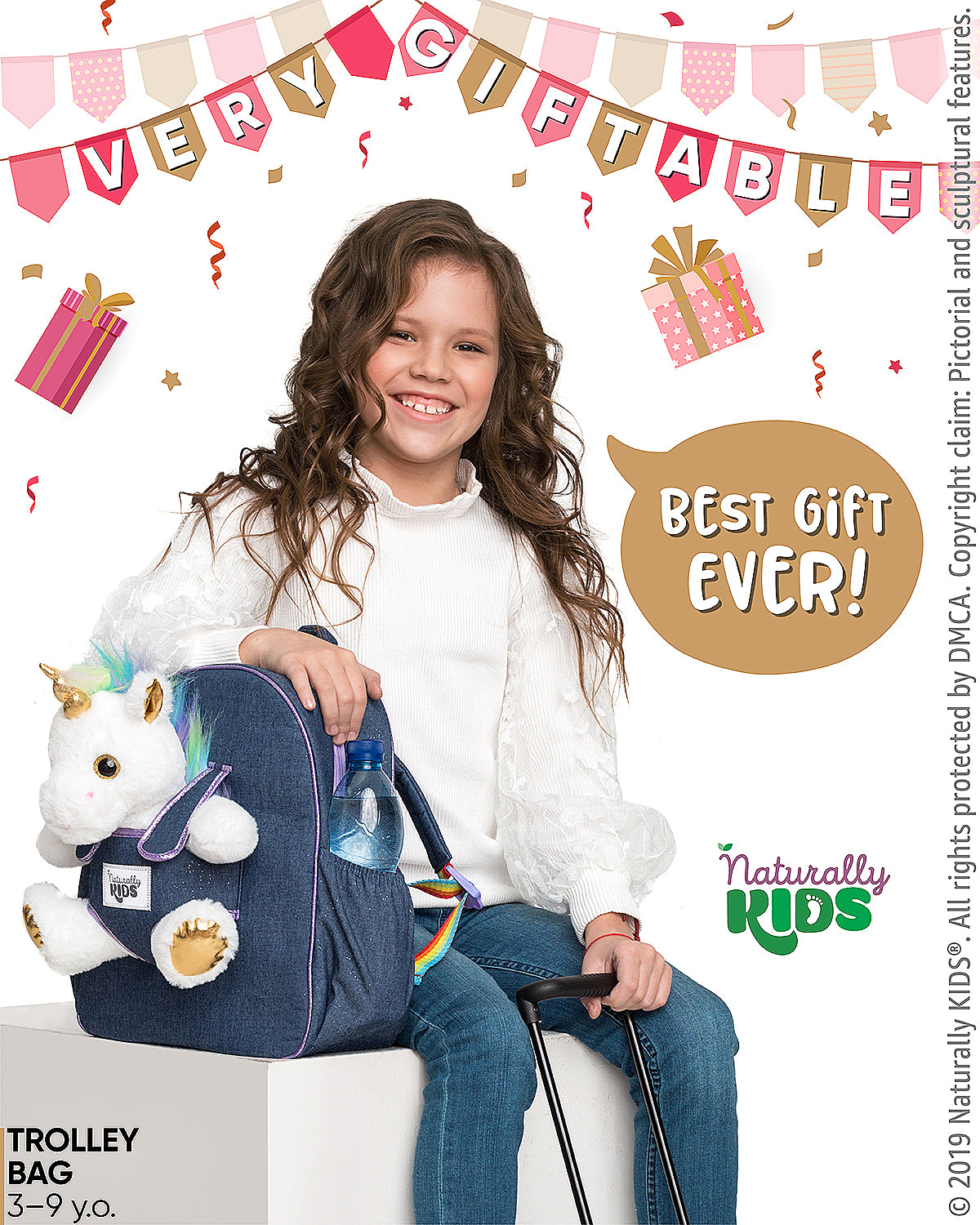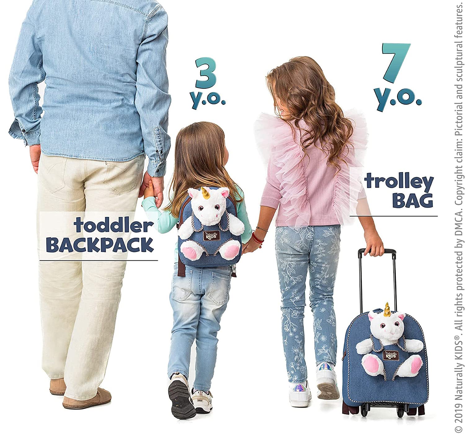 Are you looking for an ideal present for your little one who is obsessed with unicorns? Or perhaps you are searching for a unique medium travel bag for your child? Our Naturally KIDS blue denim unicorn rolling luggage with a detachable plush unicorn toy is the perfect gift for 2-, 3-, 4-, 5-, and 6-year-olds — wonderful gifts for girls or boys.