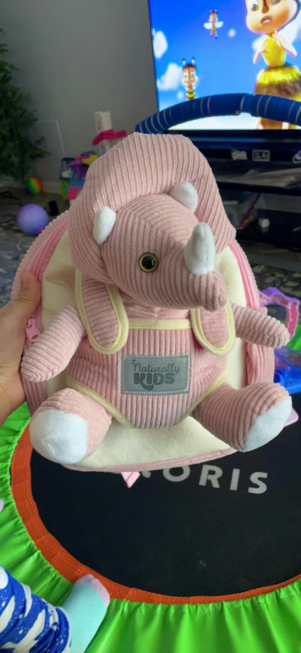 The detachable pink triceratops plush quickly becomes a favorite toy at home, on walks, or while traveling. This backpack is a charming dinosaur-themed accessory that works both as a bag and a cuddly friend.