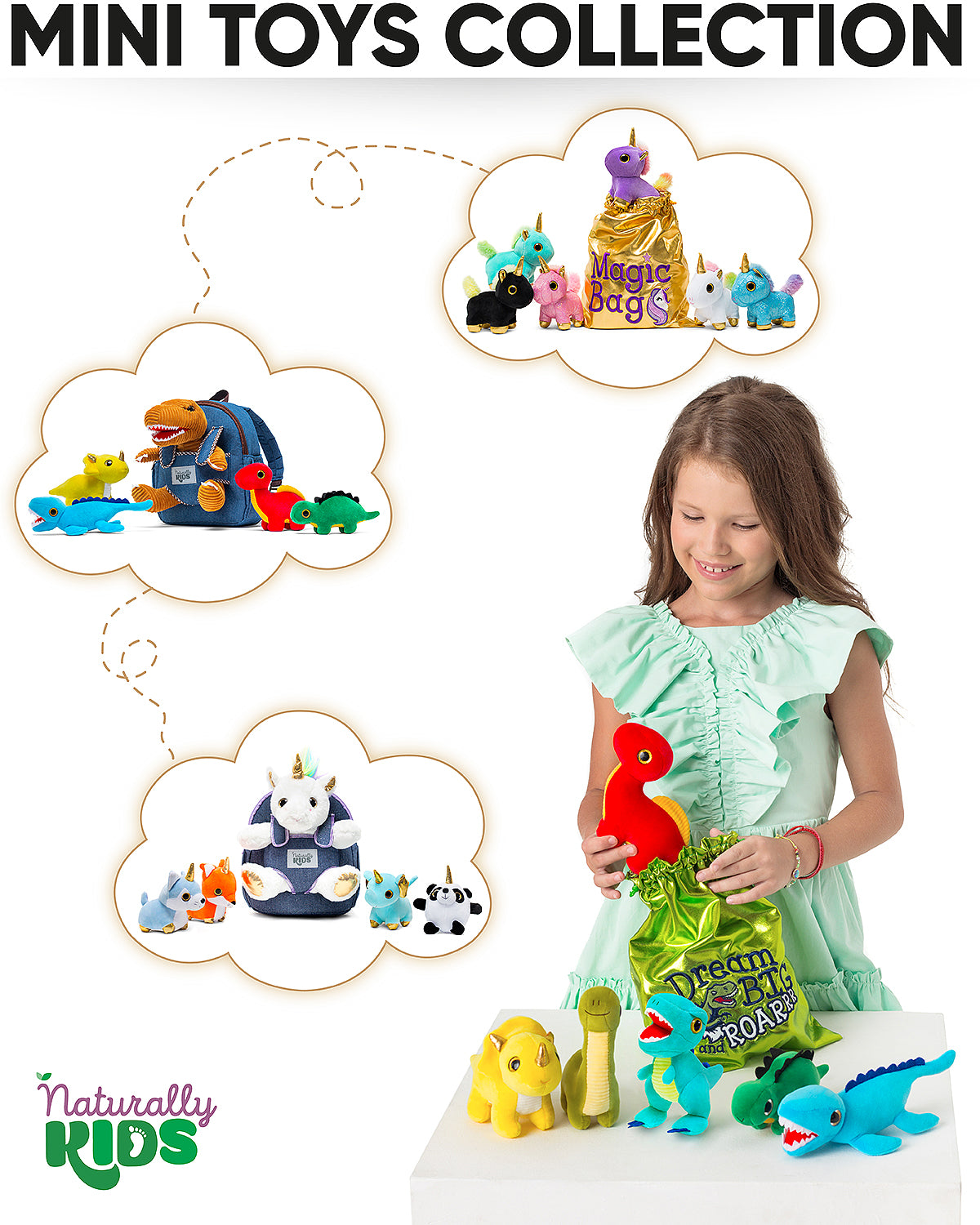 Meet the Naturally KIDS stunning new collection of miniature dinosaur toys. This exclusive sensory playset includes 6 mini dinosaur plush figures and a drawstring gift bag for easy carrying, perfectly sized for little hands.
