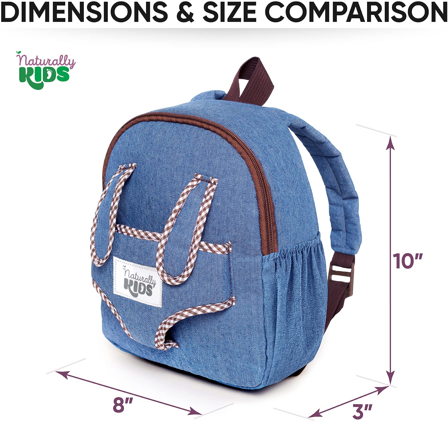 - โจ Dimensions: 10*8*3 inches. Naturally KIDS small backpack has a perfect size to carry the dolls and stuffed animals up to 8 inches.